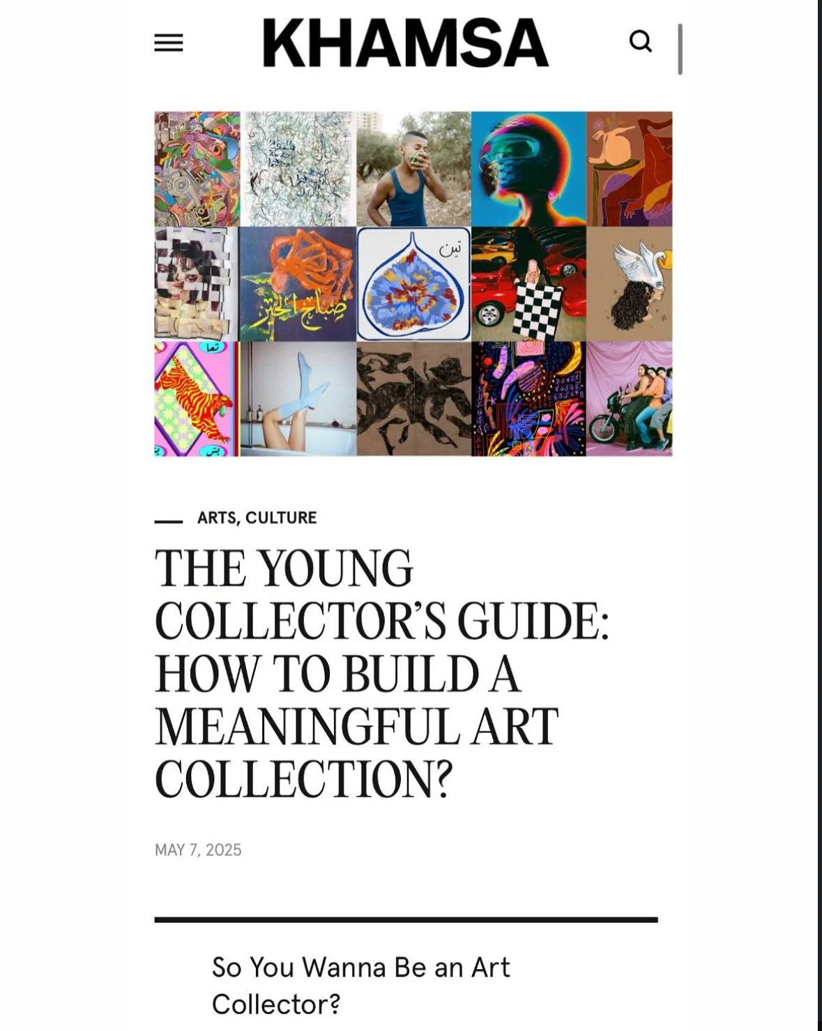 In the May 2025 issue of Khamsa Magazine, Fatima Al Kurdi authored The Young Collector’s Guide, offering her perspective on how to build a meaningful art collection. She shared an approach rooted in training the eye, nurturing a culture of collecting, and selecting works with personal meaning and intention.