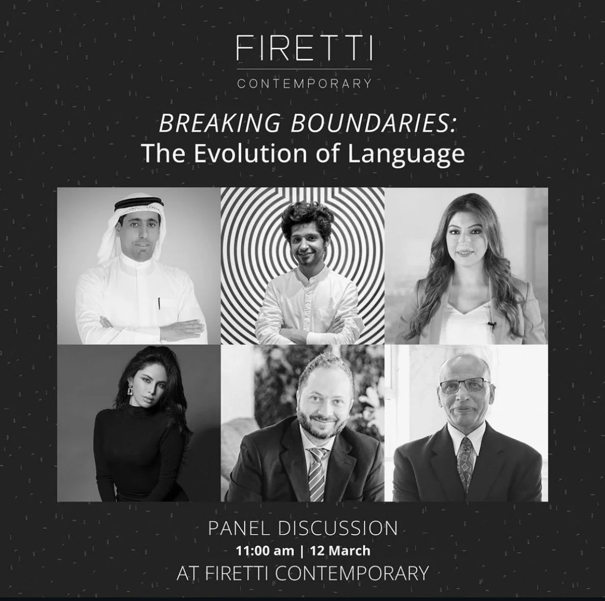 As part of Breaking Boundaries at Firetti Gallery, Fatima Al Kurdi joined a panel of six speakers to explore the evolution of language in contemporary art and culture. The conversation brought together diverse voices reflecting on how language continues to shape, shift, and expand across disciplines.